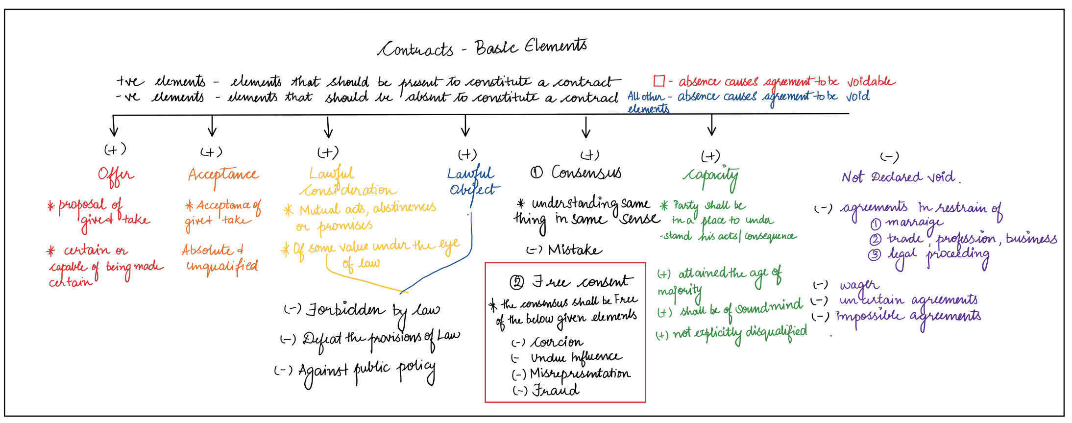 LEGAL AGREEMENTS/CONTRACTS = AGREEMENT (OFFER + ACCEPTANCE + LAWFUL CONSIDERATION) + CAPACITY + CONSENSUS + FREE CONSENT + LAWFUL OBJECT. (S.10 ICA)