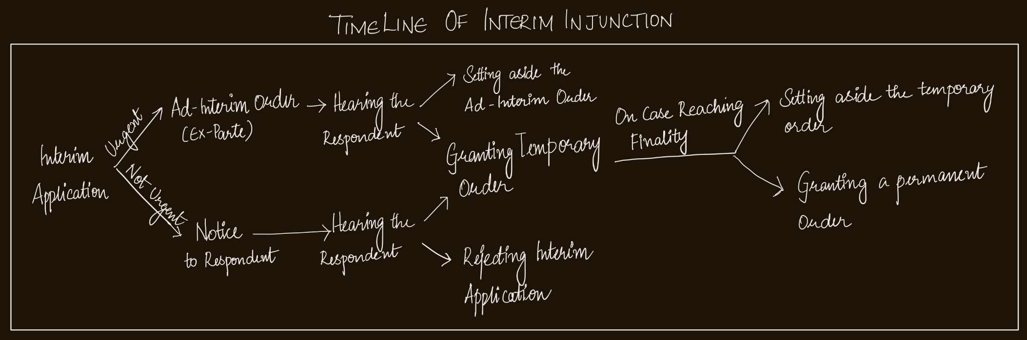 The immediacy of the relief has a lot of significance in this process of granting an Interim Injunction. Some reliefs can be so urgent, wherein, if the court refuses or delays to pass such orders immediately the party would be put at a severe disadvantage or an irreparable injury. In such cases the court acting contrary to the principles of natural justice – ‘Audi Alterim Partem’ goes on to pass an order ex-parte (without hearing the other side). Such orders are called ‘Ad-Interim Injunctions’.